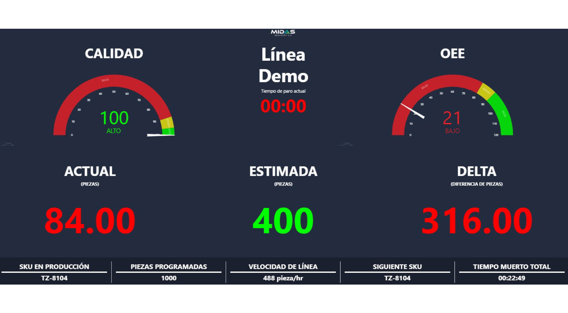 Para el control de producción al final de líneas productivas o en procesos de alto valor agregado. Permite llevar mediciones en tiempo real de OEE, eficiencia, disponibilidad, rendimiento y calidad, así como los tiempos muertos por paro y acumulado.